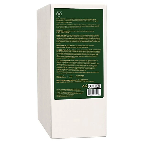 Aqua / Water / Eau, Sodium Coco-Sulfate, Glycerin, Sodium Chloride, Lauryl Hydroxysultaine, Coco-Glucoside, Sodium Cocoyl Isethionate, Sodium Benzoate, Citric Acid, Potassium Sorbate, Limonene*, Citrus Grandis (Grapefruit) Peel Oil, Citrus Limon (Lemon) Peel Oil, Citrus Reticulata (Tangerine) Leaf Oil, Vitis Vinifera (Grape) Seed Oil, Citrus Aurantium Dulcis (Orange) Leaf Extract, Nasturtium Officinale Extract, Tropaeolum Majus Flower/Leaf Extract, Jasminum Officinale (Jasmine) Oil.