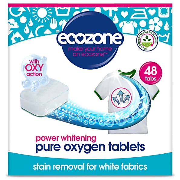 Ecozone Pure Oxygen Whitener Stain Removal Tabs for Whites – 48 tabs is part of the range of ÂÂ. Keep both your clothes and washing machine in tip-top condition with  in  and  bulk buy bottles to help reduce plastic waste, or explore the full range of , including  and , available from Big Green Smile.