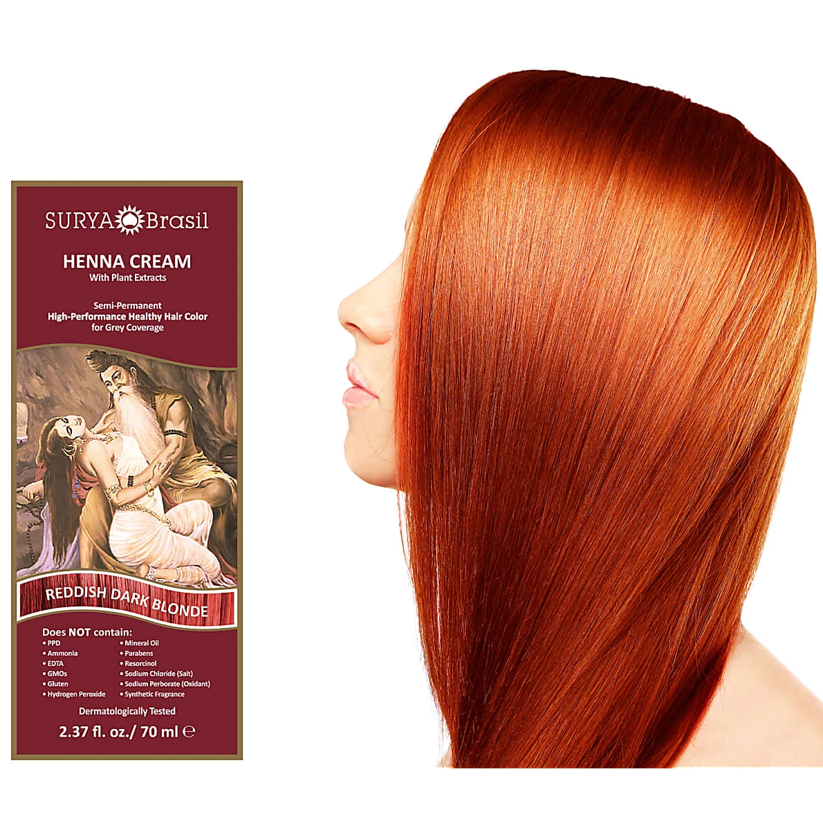 Surya Brasil Henna Cream in reddish dark blonde is a semi-permanent organic hair colour cream that contains powerful henna from India and various herbal and fruit extracts from Brazil. Enjoy complete grey coverage without the need for harmful chemicals, plus healthy shiny hair and a brilliant hair colour! What’s more, Surya Henna Cream colours are mixable, so you can create your own perfect shade easily at home.